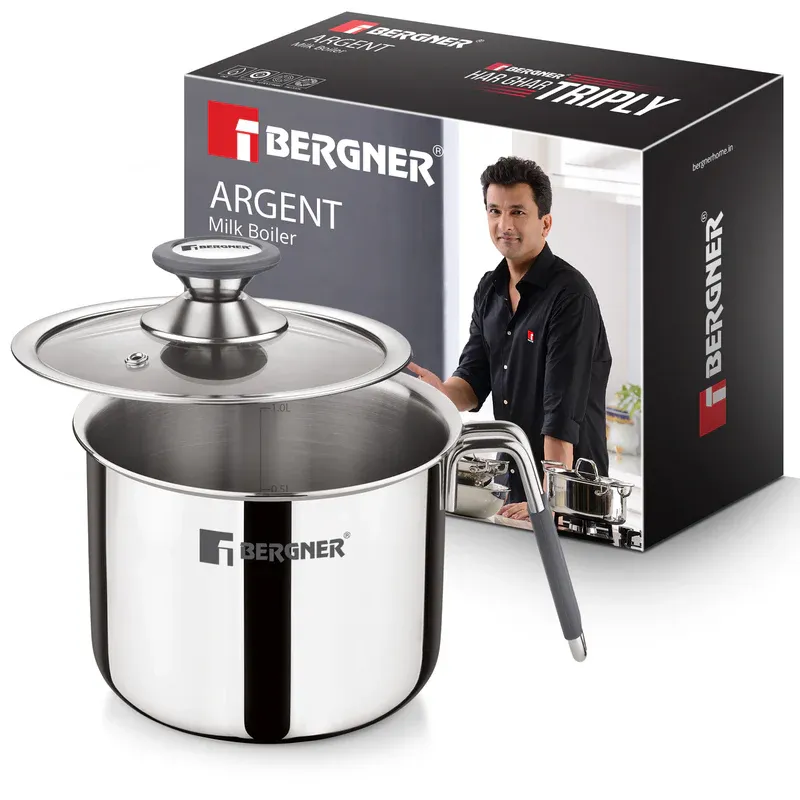 Bergner Argent Triply Stainless Steel Milk Boiler with Glass Lid, Steam Vent, Flared Rim, Stay Cool Cast Handle with Silicone Grip, Even and Faster Heating, Easy to Clean, Induction Bottom