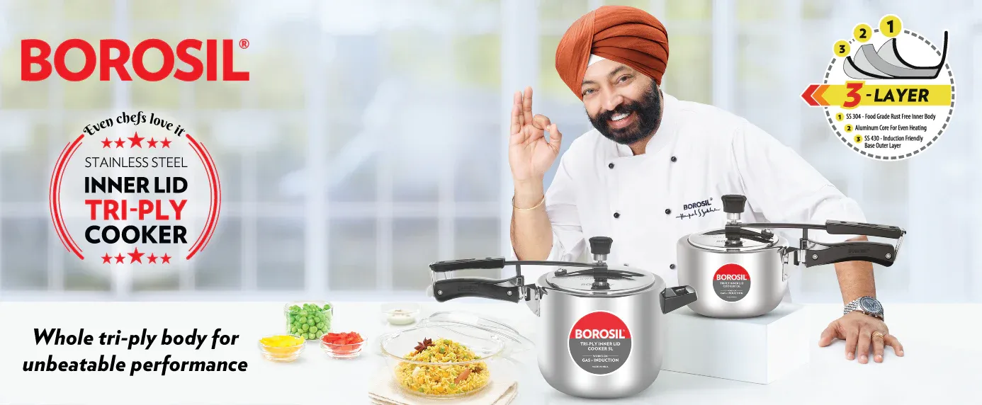 LONG-LASTING & HYGEINIC: Open the lid to happiness! Borosil triply stainless steel pressure cookers are made of SS304 stainless steel material and the high-class quality ensures it stays bright, won't pit or corrode and is hygienic.