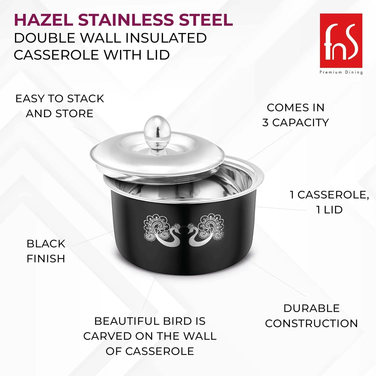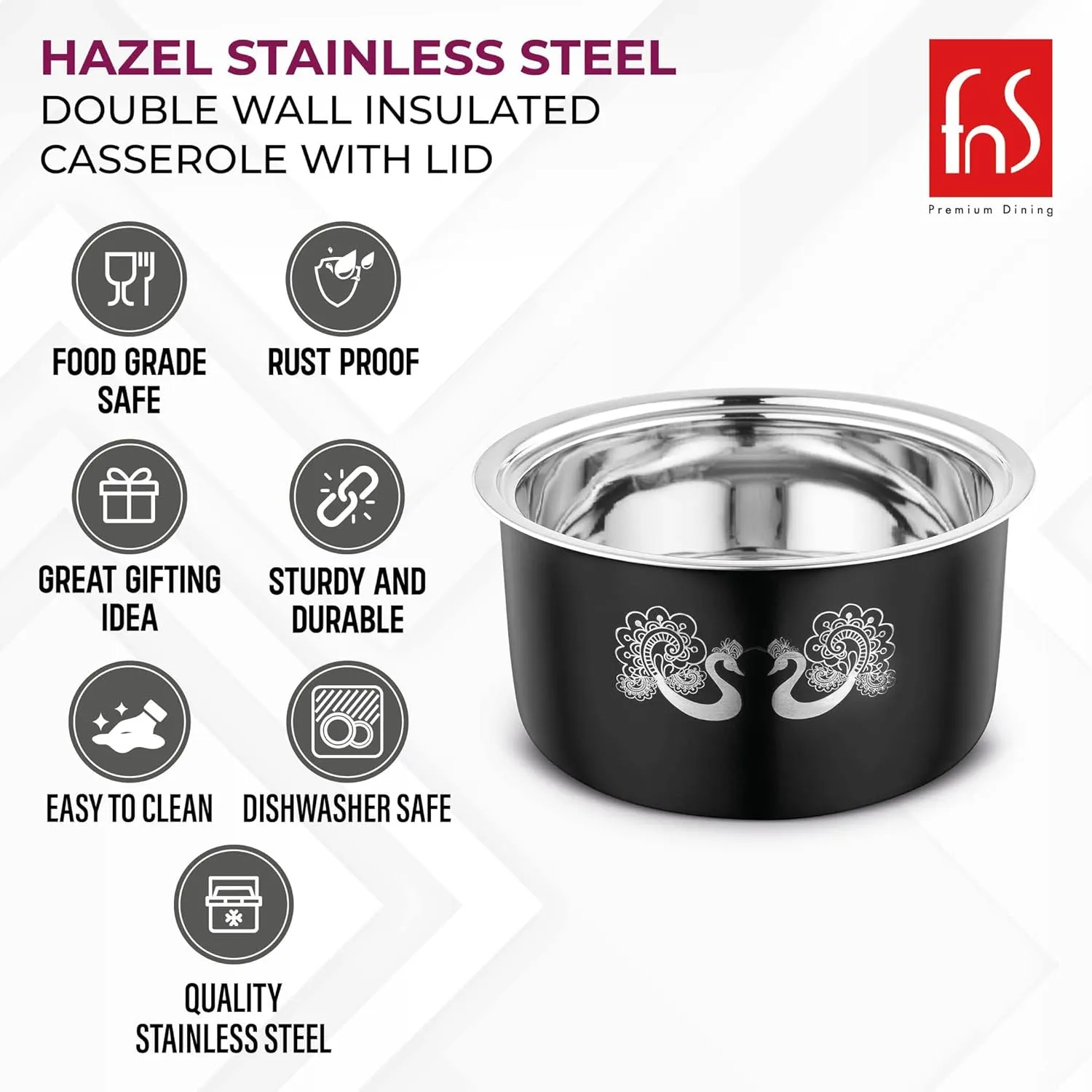 FNS Hazel Black Stainless Steel Casserole | Premium Double Wall Insulated Hot Pot with Self-Locking Press Lid