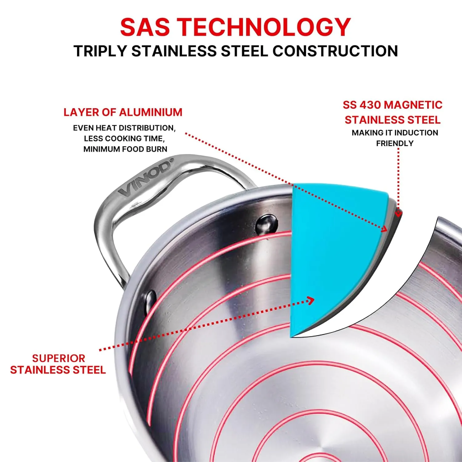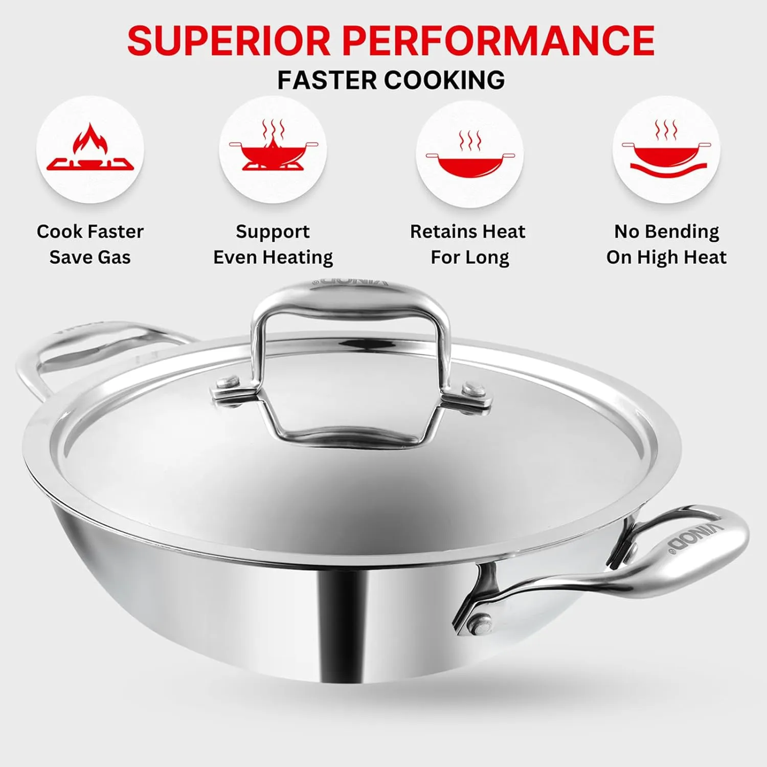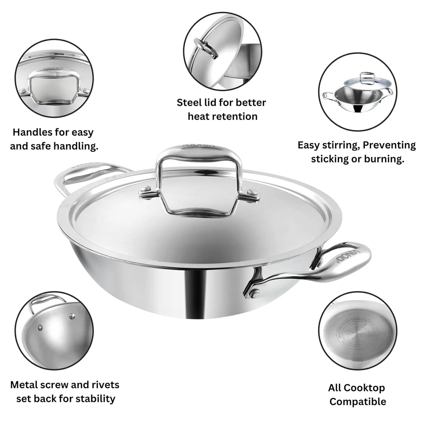 π£π₯ππ ππ¨π π§π₯ππ£ππ¬ ππ’π‘π¦π§π₯π¨ππ§ππ’π‘ : The Vinod Platinum Triply Stainless Steel Kadai is engineered with three layers for optimal performance. The inner layer is food-grade 18/8 stainless steel, an aluminum core ensures even heat distribution, and the outer layer is 430 magnetic stainless steel for induction compatibility.