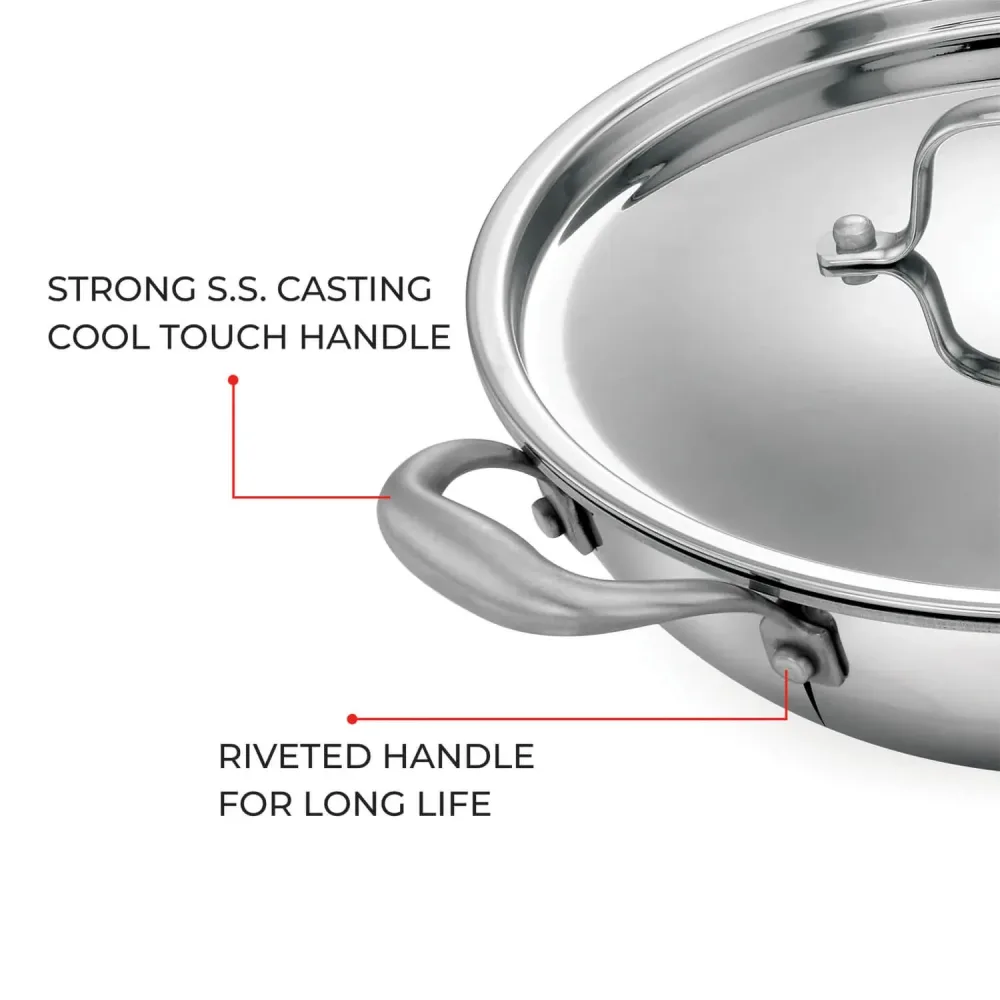 AVIAS Riara Premium Stainless Steel Triply Kadai/ Kadhai With Lid | 3 Layer | Steel Casted Stay-Cool Handles | 2.5 Mm Thickness
