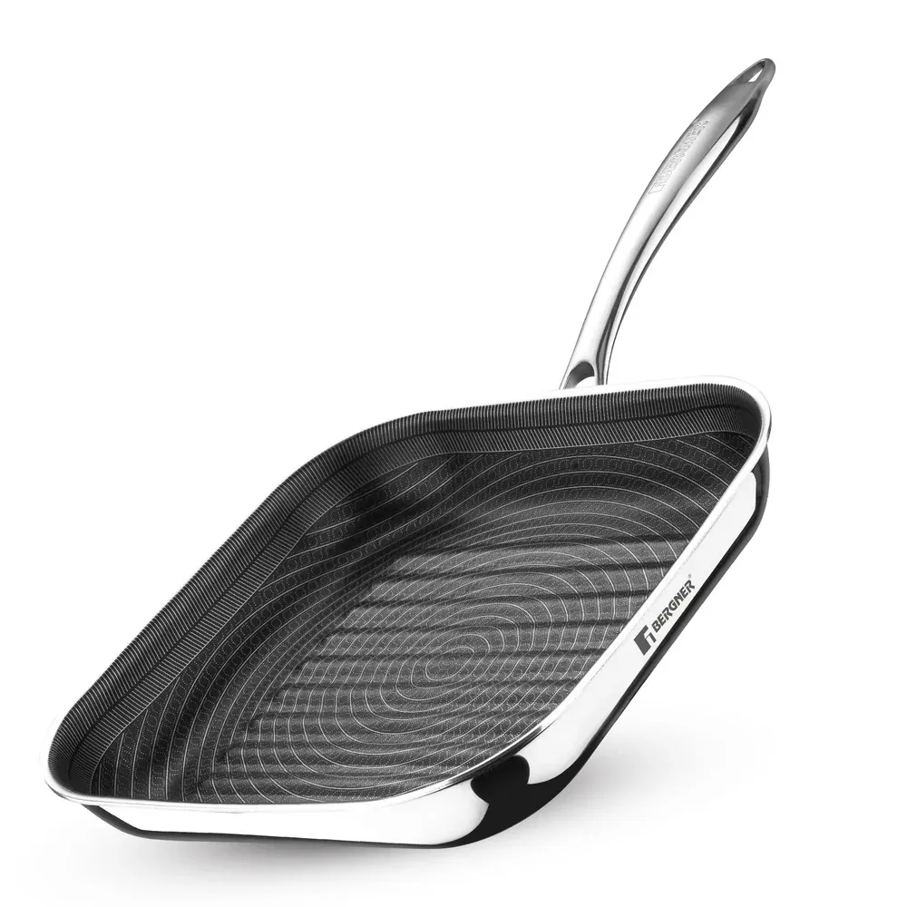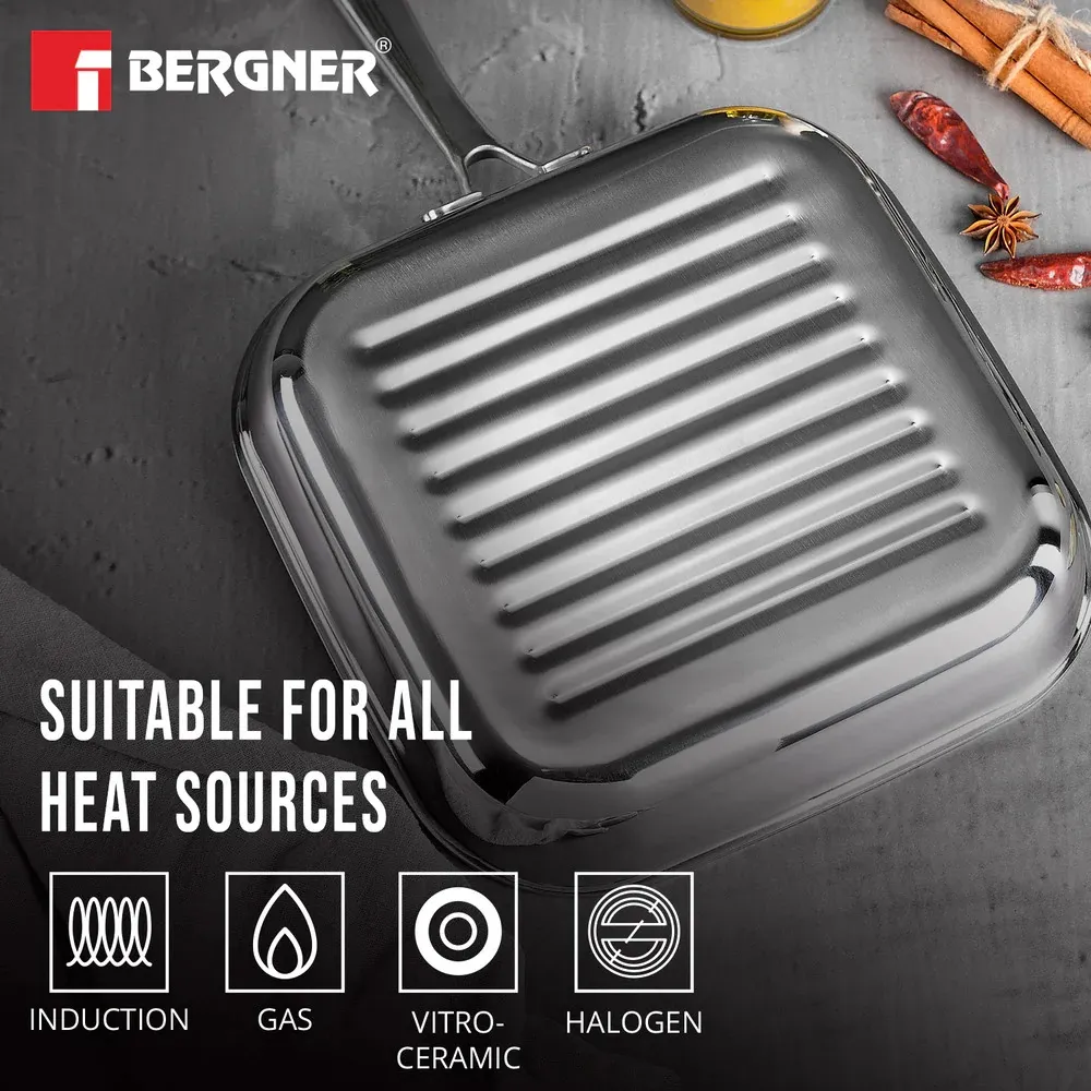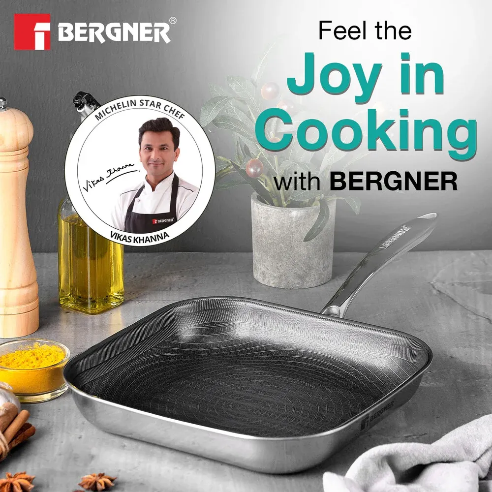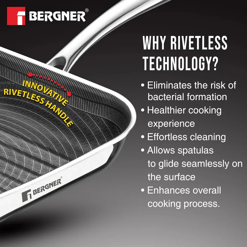 Bergner Hi-Tech TriPly Stainless Steel 24cm Grill Pan, Honeycomb Non-Stick Coating Inside, Non-Toxic, Healthy Cooking, Less Oil Use, Durable Handle with Excellent Grip - Induction and Gas Stove Ready