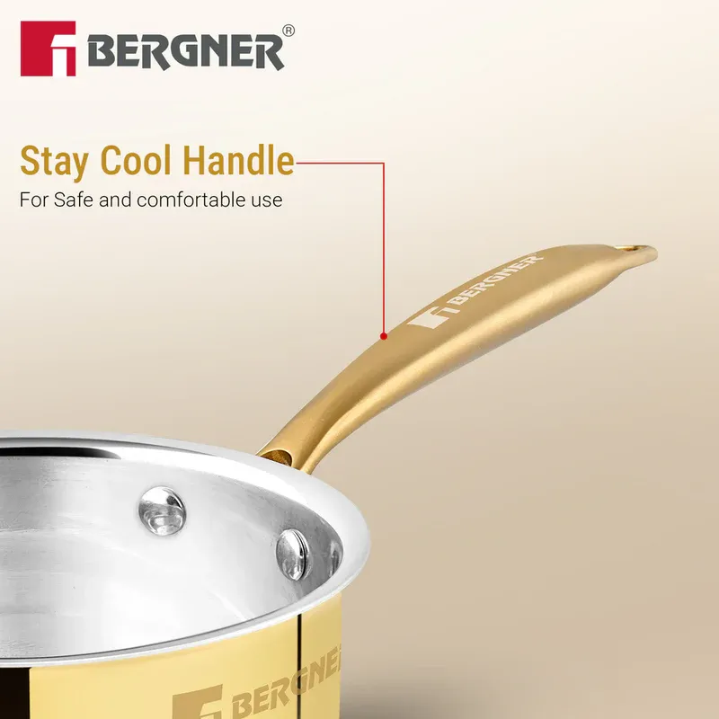 Bergner Peetlam Saucepan with Lid 16cm (1.6L), Traditional Brass Saucepan with Tin (Kalai) Coated, Healthy Cooking, Ergonomic PVD Gold Handle with Comfortable Grip, Durable - Gas Stove Compatible