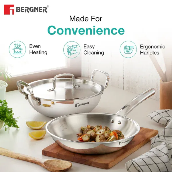 4-Piece Bergner Cookware Combo Set : Includes a 22cm Kadai (2.1L) with Lid, 22cm Frypan (1L), and 14cm Teapan (1.1L); Perfect for everyday cooking needs!