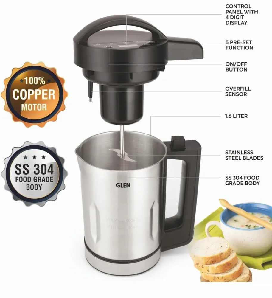 A versatile appliance having 1.6 litre stainess steel jar and blades. Featuring multiple functions including blend, keep warm, smoothie, chunky soup and smooth soup, it caters to various culinary needs. The user-friendly control panel with a 4 digit display ensures easy operation, while the overfill and overspill sensor adds convenience and safety. Powered by 1040W, this soup maker guarantees quick and consistent results every time.