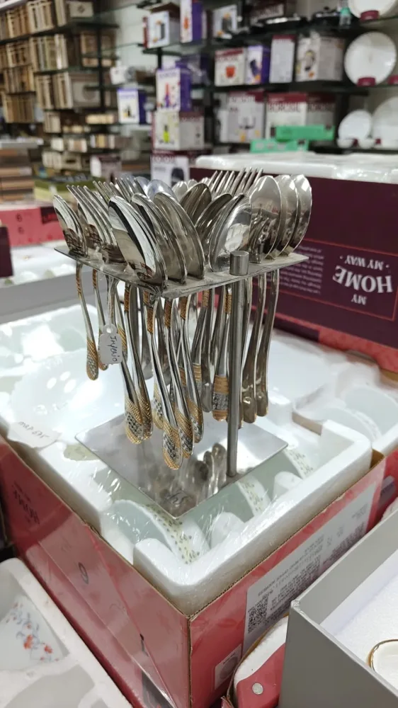 Life Time Warranty 6 Dinner Spoons 6 Dinner Forks 6 Teaspoons 6 Baby Spoons 1 Cutlery Stand 24 Karat Gold Plated Elegant Design Durable Construction Perfect for Home and Kitchen Premium Stainless Steel